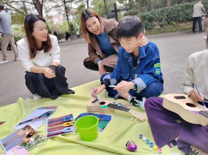 活动精心设计了“手绘尤克里里”“家长专家面对面学习坊”等环节。在“手绘尤克里里”亲子共创环节中,通过自己亲手制作的尤克里里,孩子们奏响了最美的音符,拨动心弦,传递快乐。色彩与音符的碰撞,不仅让孩子们体验了DIY的乐趣,还激发了他们的创意兴趣和动手能力,同时,也让亲子家庭共同享受了彩绘手作与音乐的美妙结合,进一步拉近了亲子关系,增进了彼此间的感情。
