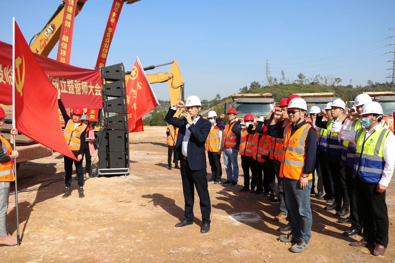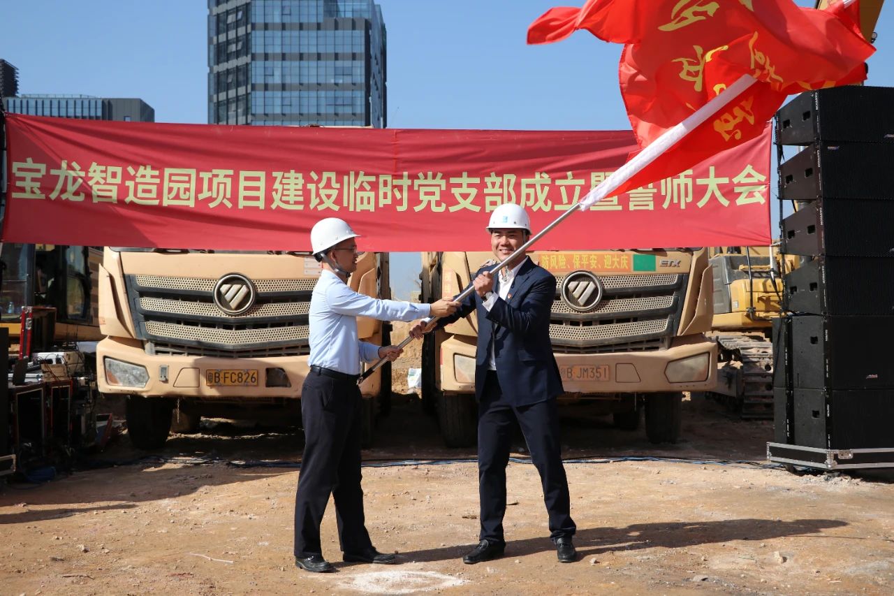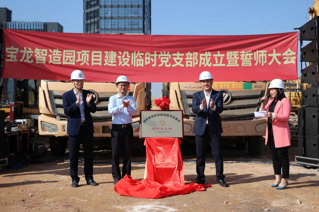 12月28日上午,在宝龙街道新能源产业基地宝龙智造园项目施工工地现场,举行了简短、简朴而隆重的临时党支部成立仪式暨誓师大会。党支部成员重温了入党誓词,城投集团党委书记、董事长给施工单位成立的项目突击队授旗,全体参建人员振臂高呼,集体誓师,随后立即投入工作,挖掘机、运土车等开始轰隆作业,现场气氛热烈。宝龙智造园项目在撸起袖子加油干的火热气氛中正式启动。
