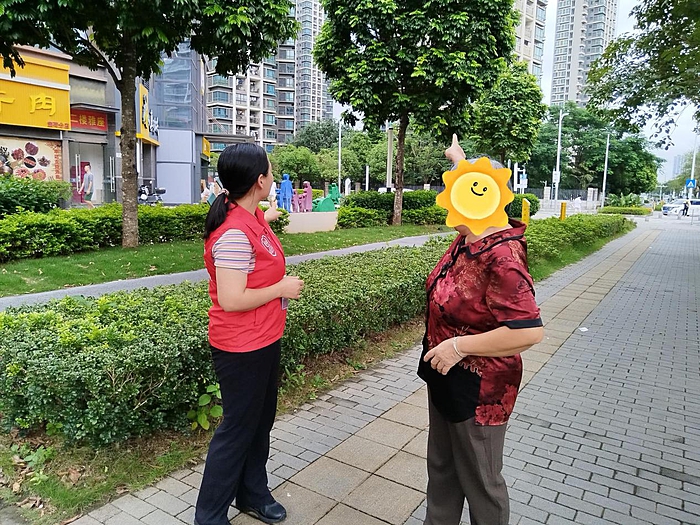 在护送长者回家途中,杨清霞了解到长者是前几日刚到深圳,且是第一次来深,平日只在小区逛逛,当天看天气舒适才出来走走熟悉环境,不成想竟找不到回家的路。杨清霞一边用轻松的语气与长者闲聊,一边则充当“导游”向长者介绍社区的基本情况,帮助长者对其居住的小区及社区环境有更进一步的了解。步行大约20分钟后,杨清霞与长者顺利抵达峦山美地花园小区,长者对杨清霞的热心帮助连连道谢。