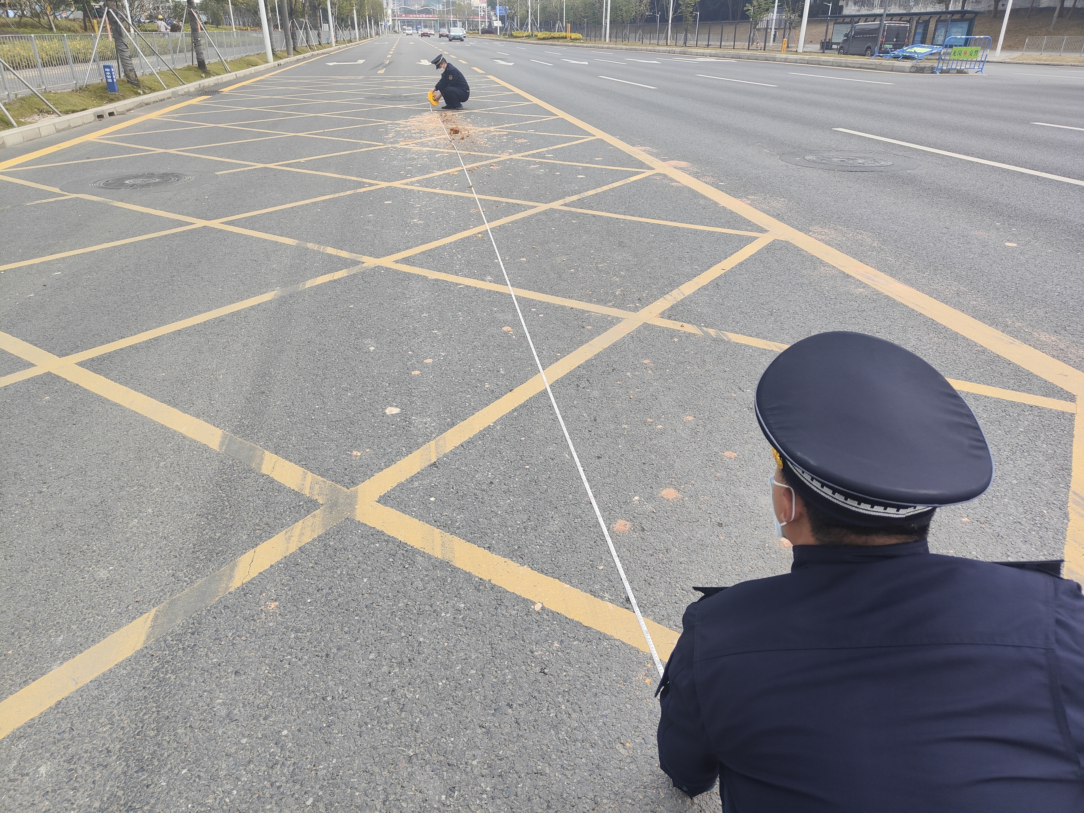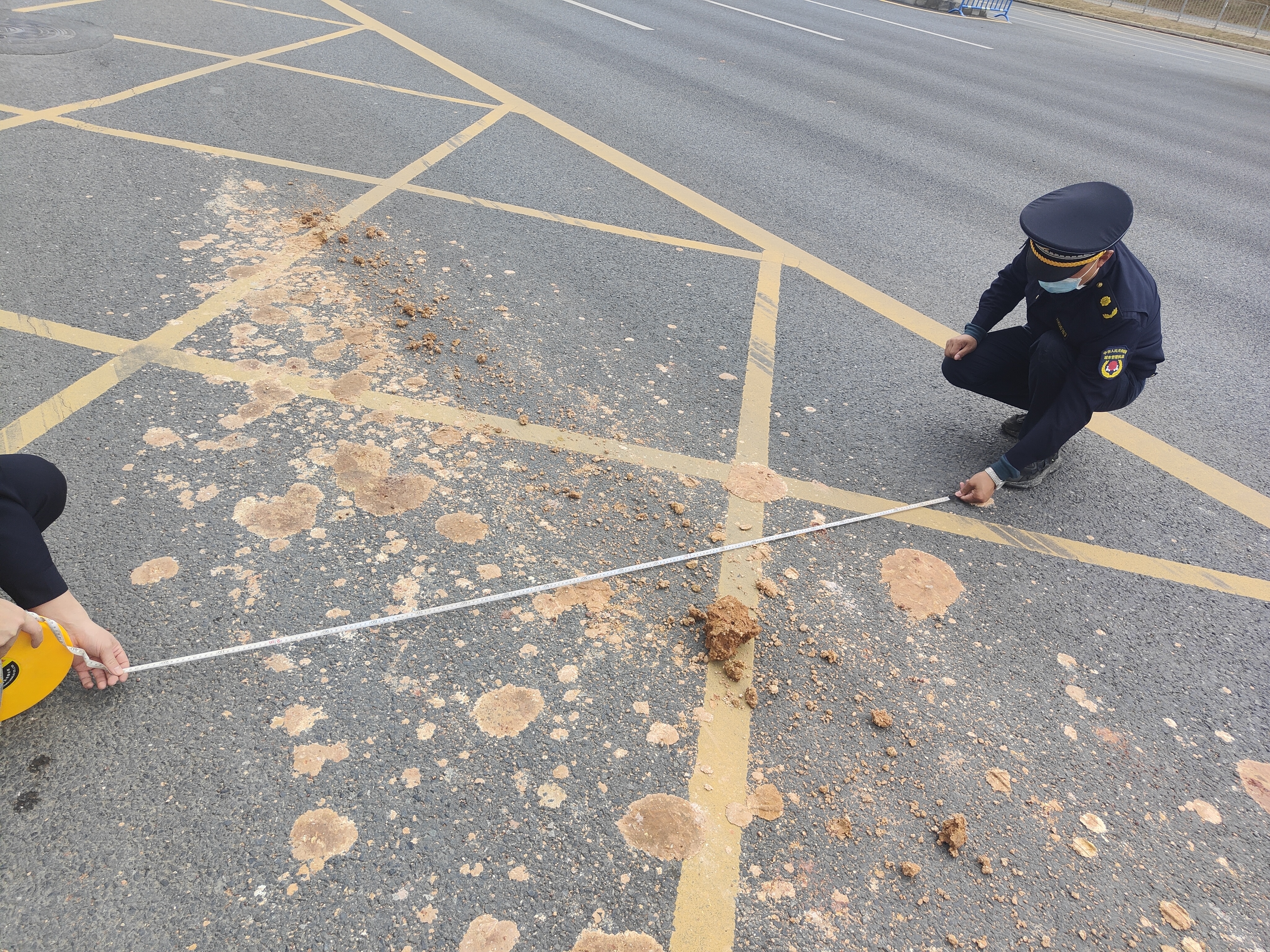 现场,执法队员对现场污染的面积进行勘察,并调取道路两侧监控探头的视频追查相关线索,成功锁定2台涉事车辆。通过相关视频,发现两台涉事车辆均因为密闭措施未做好,运输途中遇到道路颠簸或者急刹车造成余泥从车厢撒漏,导致道路污染。在完成调查后,该执法队根据现场道路污染的面积,分别对这两台泥头车所属运输公司处以6204、8712元罚款。