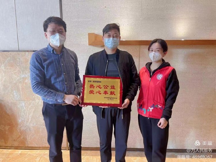 同心社区党委副书记余远遥为爱心人士——胡学宜颁奖,感谢他为此次表彰提供了爱心物资。