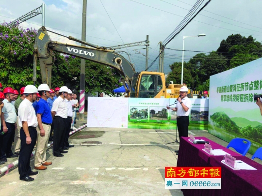 山厦河综合整治项目征拆节点整体移交暨草堆岭段房屋拆除仪式。