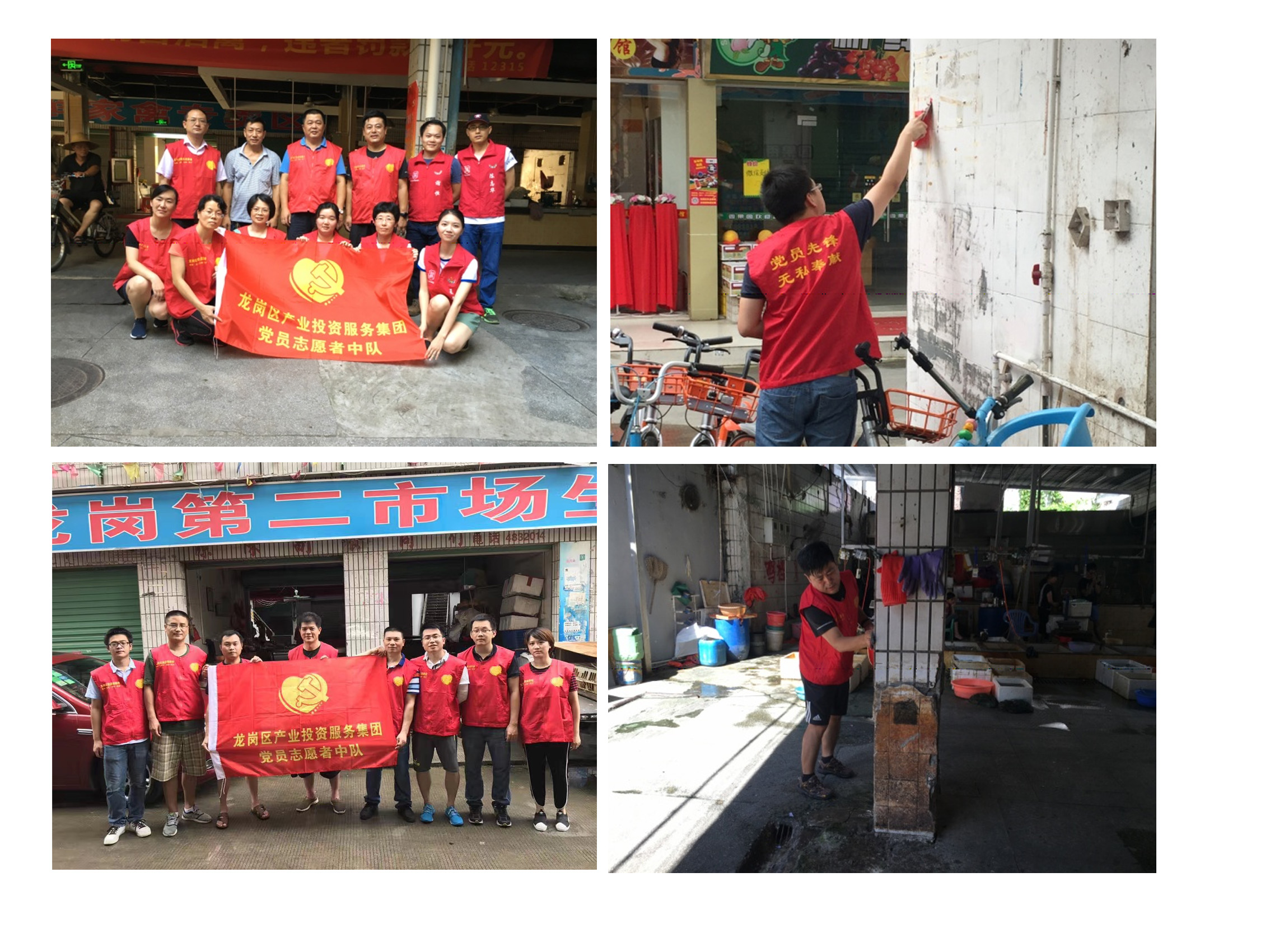 为推进“两学一做”学习教育常态化制度化,积极参与我市的文明城市创建工作,努力践行“城市质量提升 国企党员先行”党员志愿服务活动,进一步提高国企党员志愿者服务活动的质量。根据区投党委《关于开展以“创建文明城市”为主题党员志愿者集中服务月活动的通知》要求,产服集团党总支分别于2017年7月15日、8月12日,组织辖属深龙地产公司党支部、国高育成公司党支部及外经公司党支部赴龙岗第二市场开展以“创建文明城市”为主题的“党员志愿者集中服务月”活动。