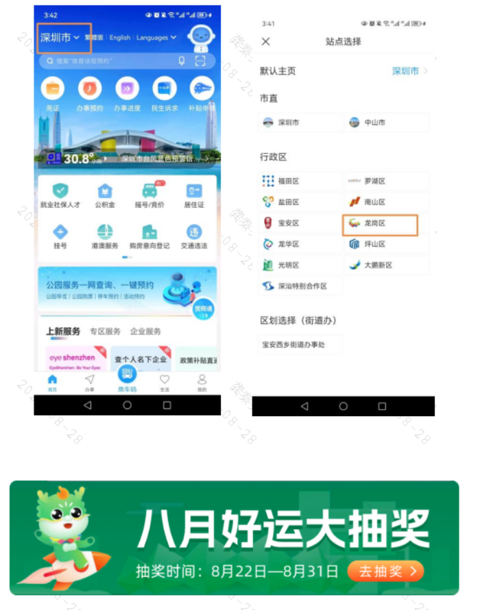 2.进入i深圳-龙岗专区,点击“八月好运大抽奖”活动页面参与抽奖。