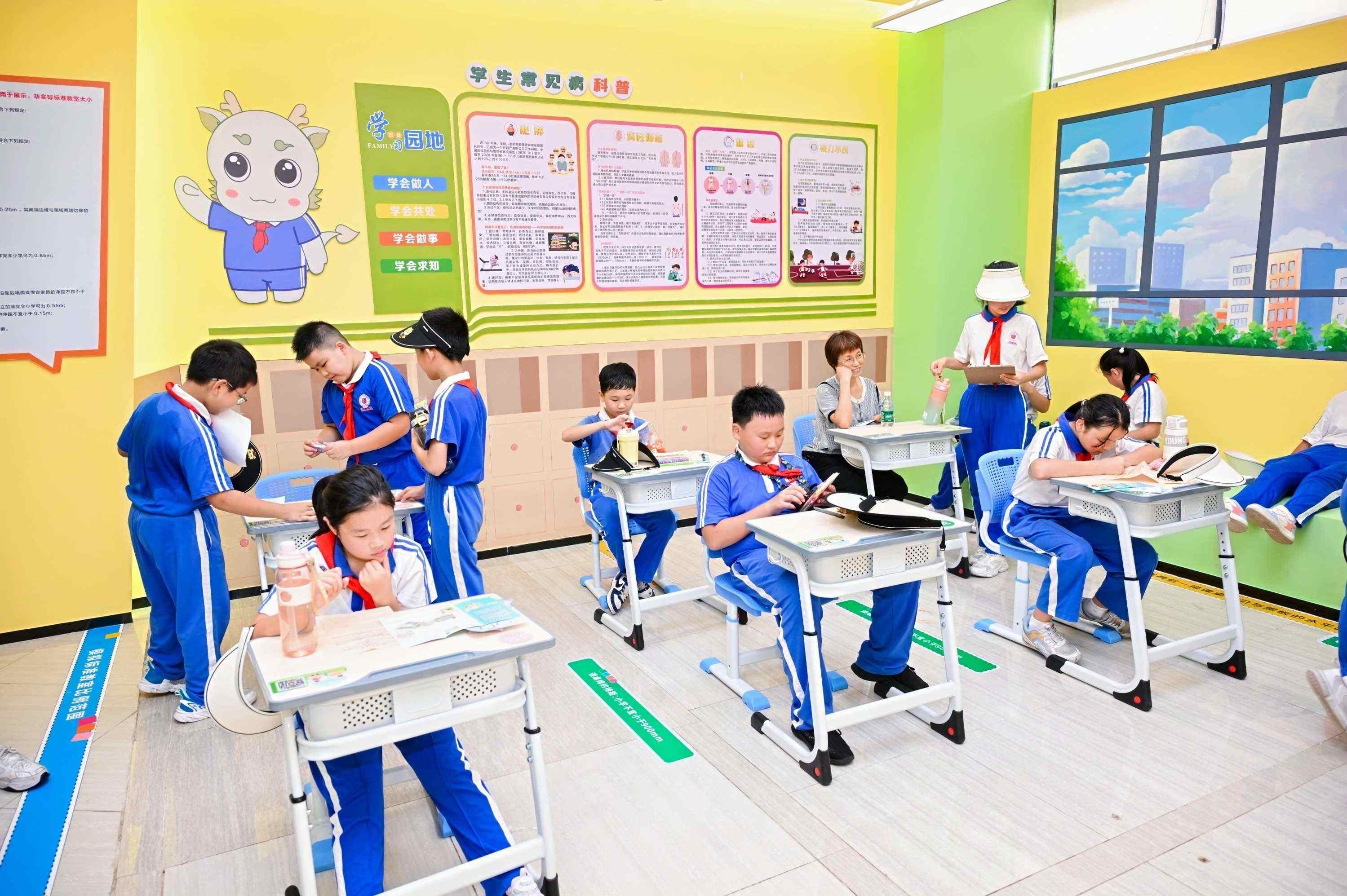 值得一提的是,近年来,近视、脊柱弯曲异常等学生常见病高发,良好的教学环境对于预防学生常见病尤为重要,为此馆内还设置了模拟标准教室。该教室按照相关标准还原学校标准教室的采光效果、灯具照度、课桌椅调试等教学条件,并设置了线上交互体验小程序,参观者通过扫码并输入自己的身高,即可一键获取适合自己的课桌椅高度。“原来课桌椅的高度这么重要,以后我会根据身高调整好课桌椅高度,好好保护我的眼部和脊柱健康。”一名学生参观完科普馆后说道。