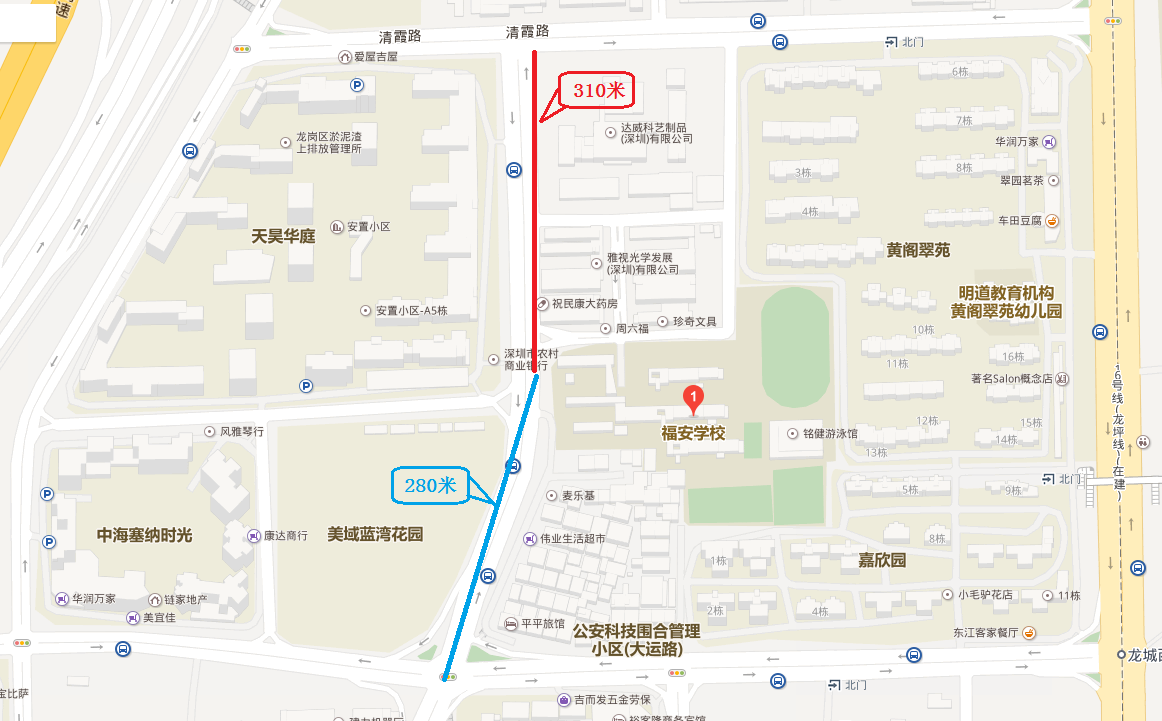 pg电子官网 福安学校位于龙城街道黄阁坑社区,龙飞大道以东,青霞路以南。学校为九年一贯制学校,现有50个教学班,学生2482人,教职工214人。据校方统计,70%的学生就学需横跨龙飞大道,可是从福安学校跨越龙飞大道需往南步行280米或往北步行310米才有可通过的红绿灯。如下图: